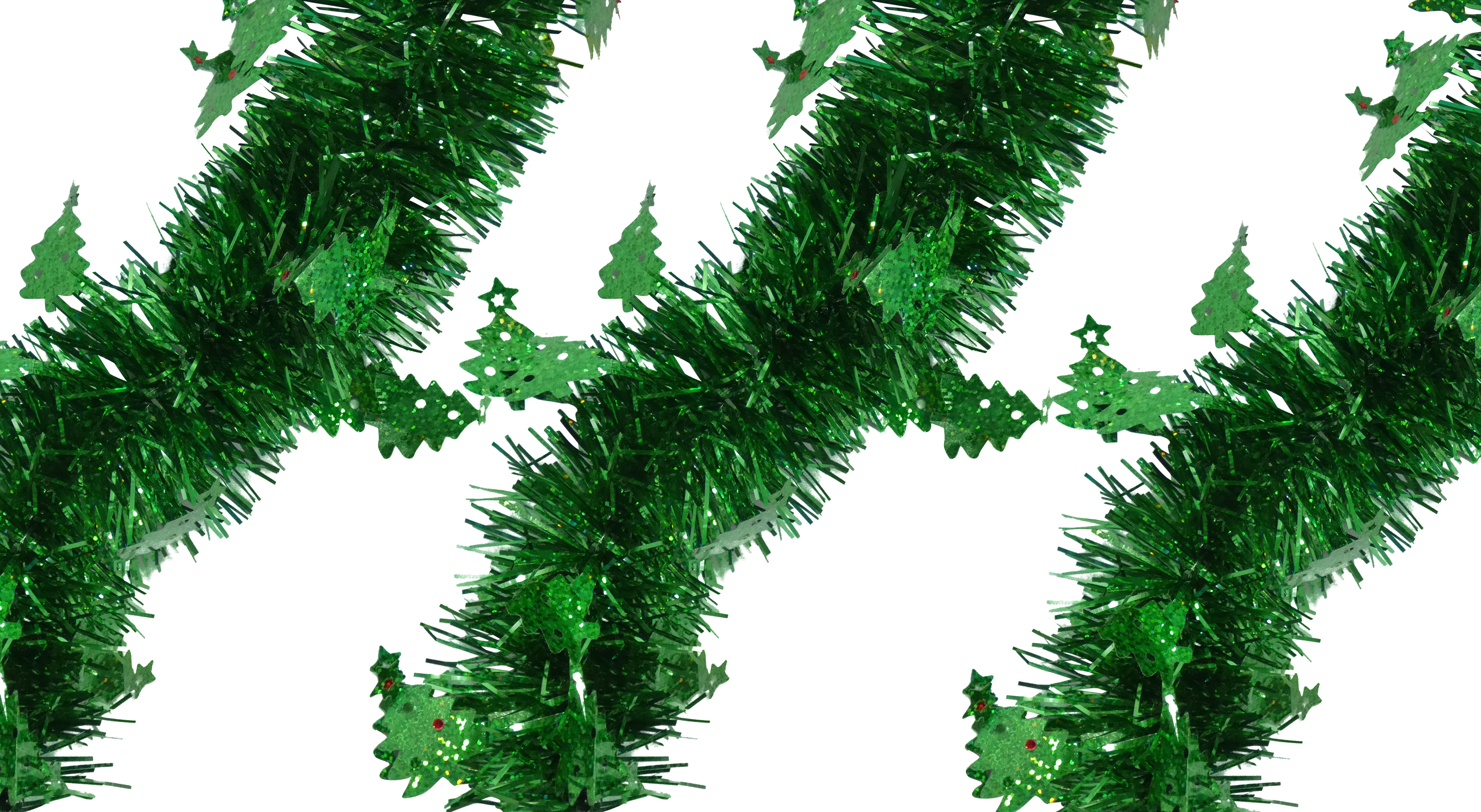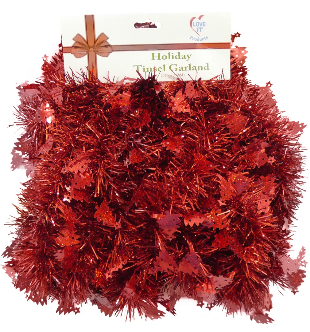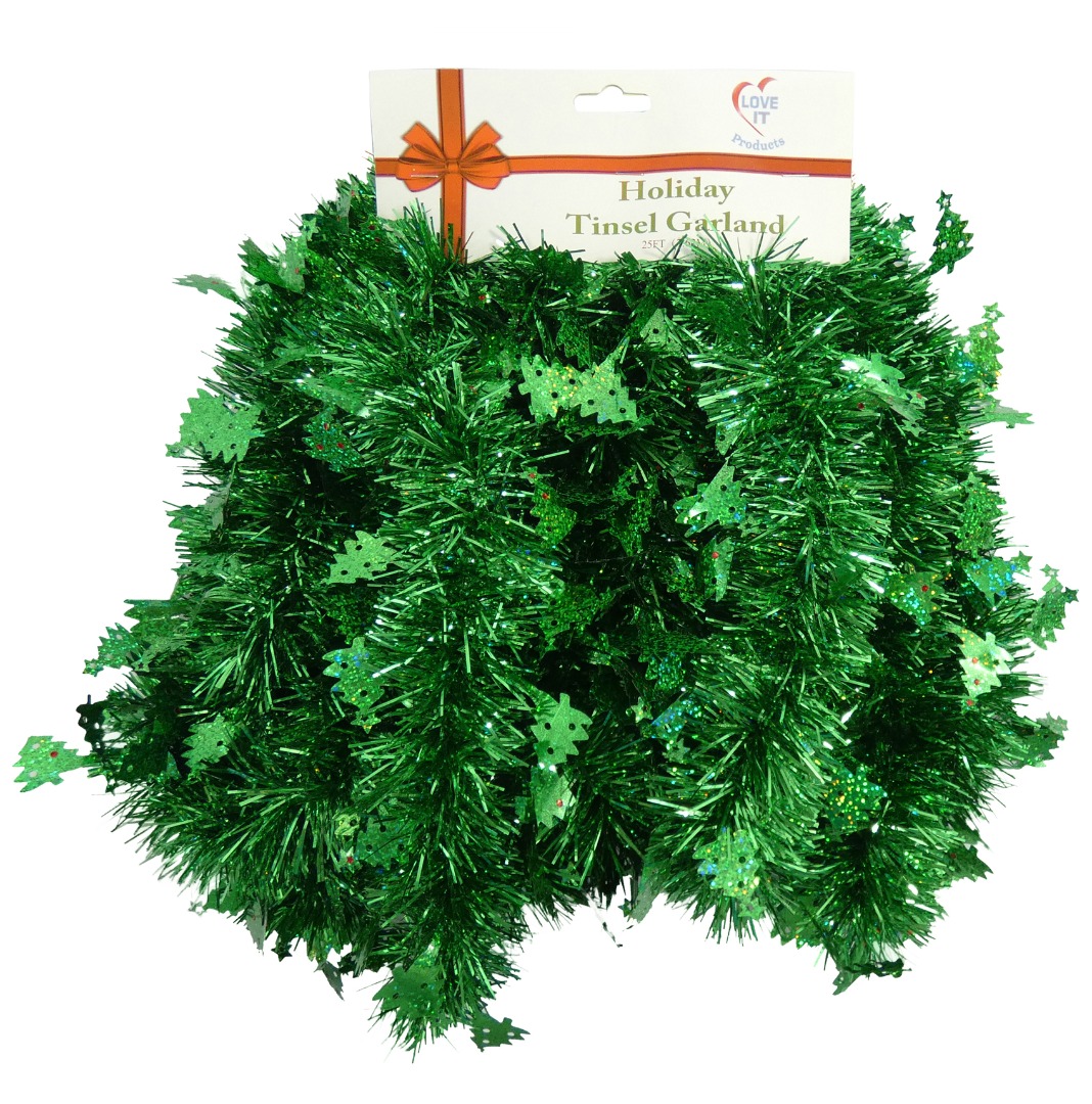 25 Ft. Long Beautiful Seasonal Holiday Tinsel Garland with Decorative Tree Charm Accents from Love It! Products. Use for Christmas, Thanksgiving, New Years, Birthday and any celebration, party or event. Super Lush with 7 Layers of Tinsel. Green