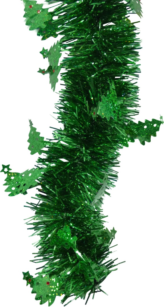 This shimmering fine foil tinsel decoration adds color and elegance to your home, office, public or private party decor. Available in assorted Holiday colors: Green or Red. Accented with Shining Christmas Tree Charms.