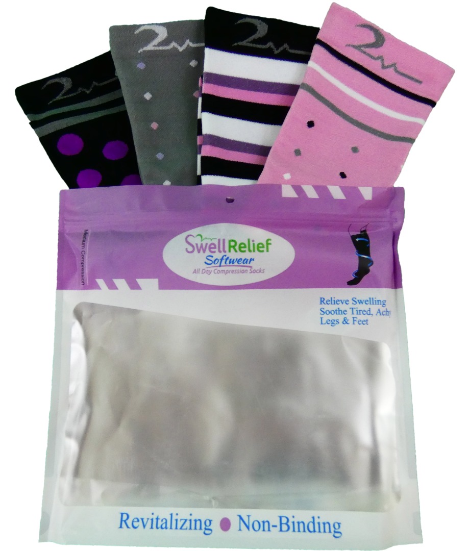 Swell Relief Soft Wear Moderate/Medium Graduated Compression 15-20 mmHg. Designed for support, and comfort. Fits womens shoe size 5-8.5 & Mens size 4-7.5. Total Qty. 4 Pair.