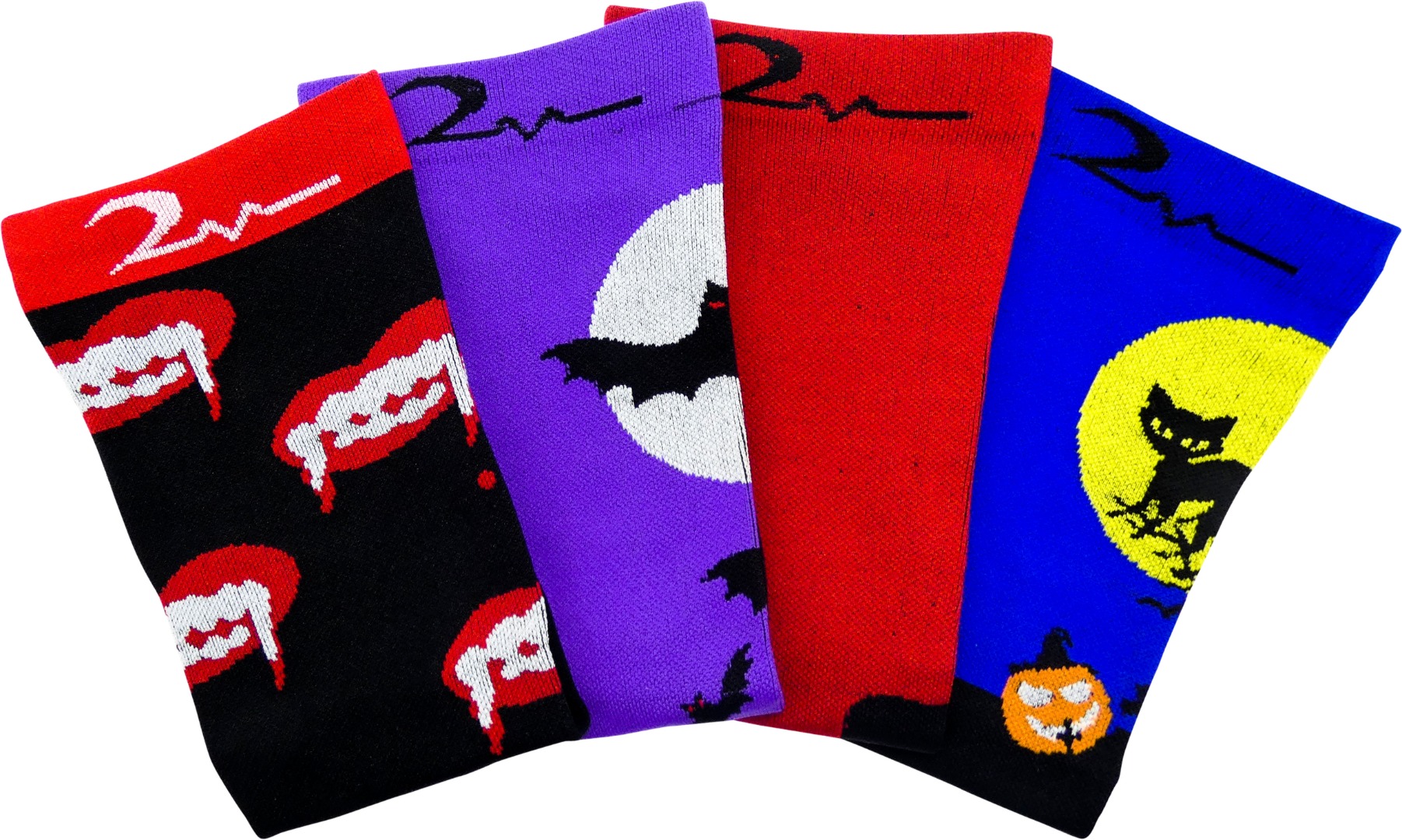 Fashionable, Fun, Colorful Knee-High Stockings for business, sports or casual wear. Anatomic Design with toe & heel pockets. Non-Restrictive Top Band with Stay-Up Performance. Assorted Designs and Colors. This 4 Pack: Dripping Blood Red & Black - Spooky Purple Sky, White Full Moon & Haunting Black Bats - Bloodthirsty Red Lips, Menacing White Vampire Fangs on Black - Midnight Blue, Golden Harvest Moon, Shadowy Black Trees & Scary Black Cat & Orange Jack-o-lantern. 4 Pair.