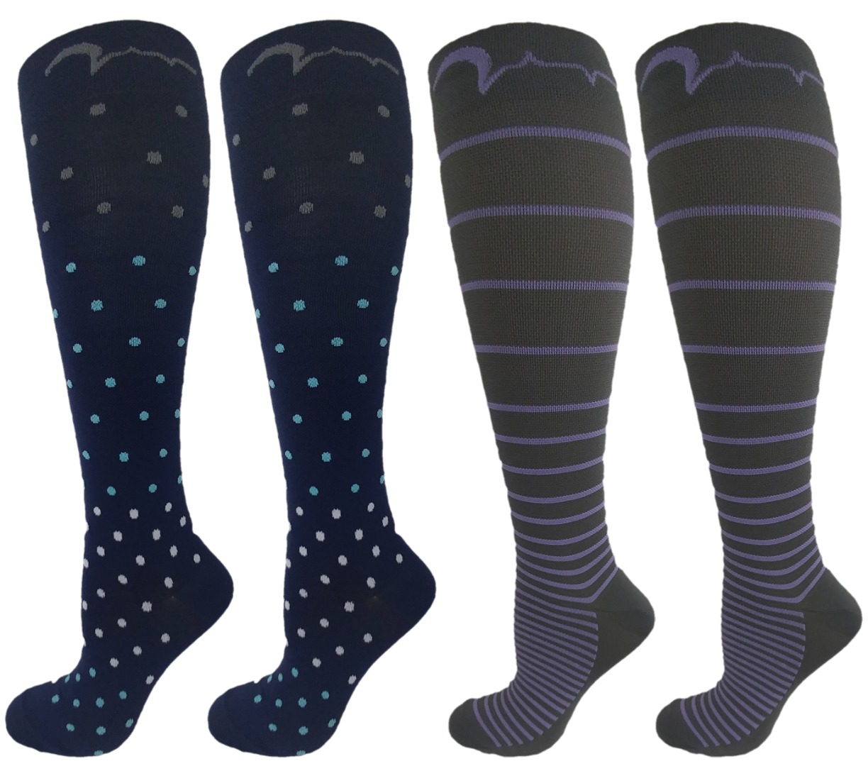 Compression socks help your body pump blood back to your heart as it moves through your circulatory system. They enhance circulation, revitalize tired and achy legs, relieve swollen ankles, and provide plantar and arch support. There is enough compression to adhere to the shape of the leg without binding or creating a tourniquet effect on circulation. Note: 15-20 mmHg compression socks will fit tighter than mild compression socks or regular non-compression socks.