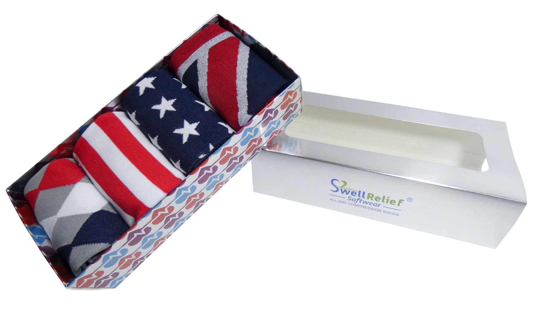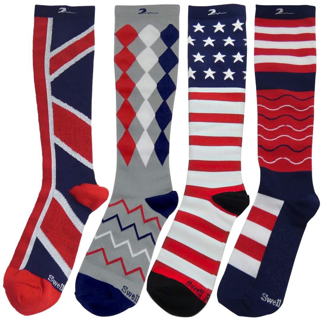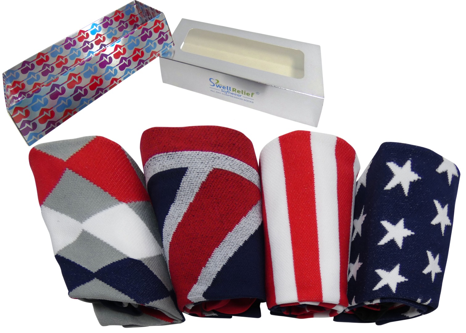 Swell Relief Extra Soft Wear Premium Quality Moderate/Medium Graduated Compression 15-20 mmHg Design Sock with Arch & Plantar Support. Designed for support, and comfort for Recovery, Performance, Endurance, Running, Shin-Splints, DVT, Edema and more . God Bless America & British Flag Colors. Total Qty. 4 Pair. Small/Medium Fits Women’s shoe sizes 5-8 and Men’s 4-7