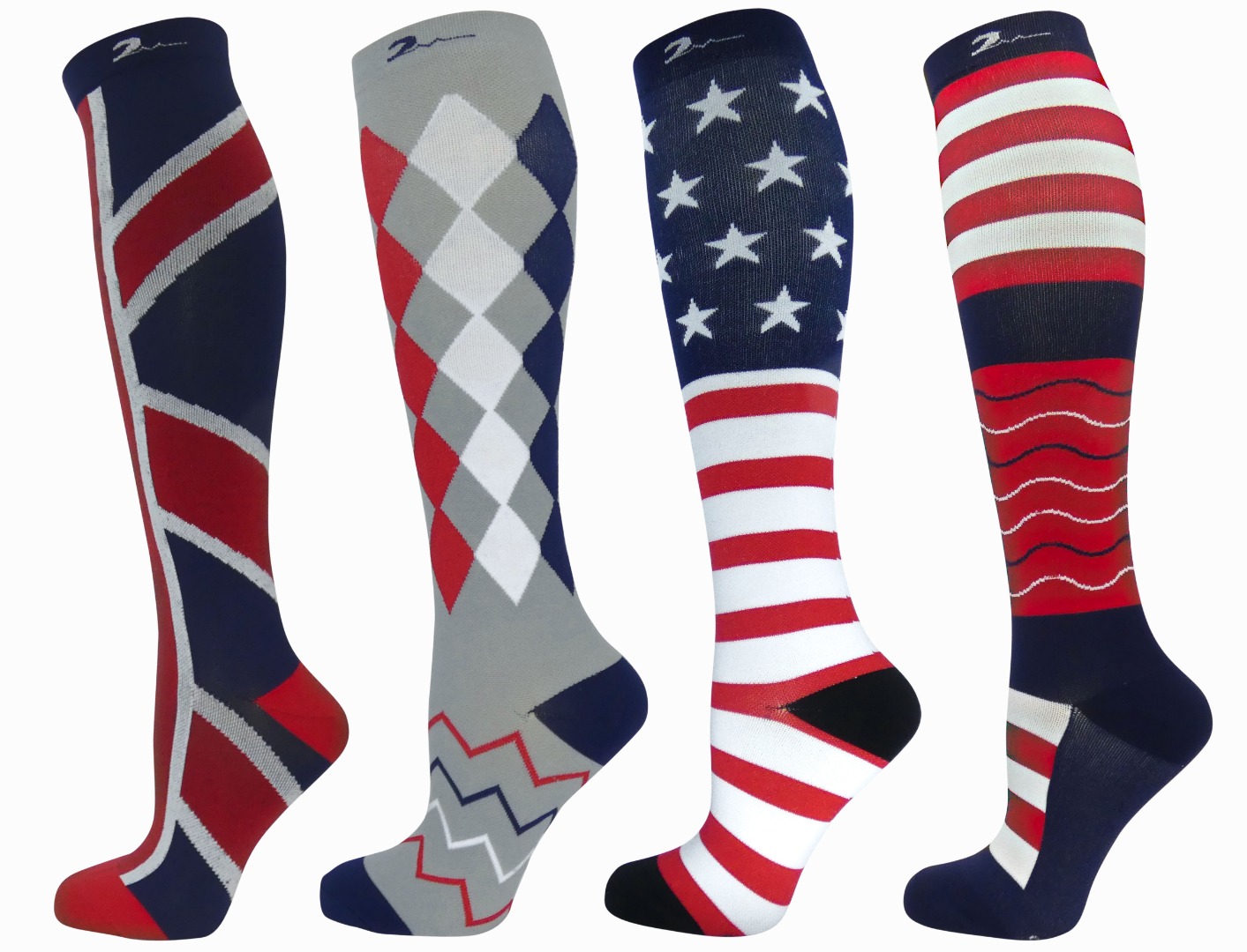 4 Pair S/M All American Flag & Novelty Moderate/Medium Graduated Compression Socks 15-21 mmHg. Nurses, Running, Travel & Flight Knee-High, Mens & Womens Comfort Blend. USA & UK Red, White & Blue.