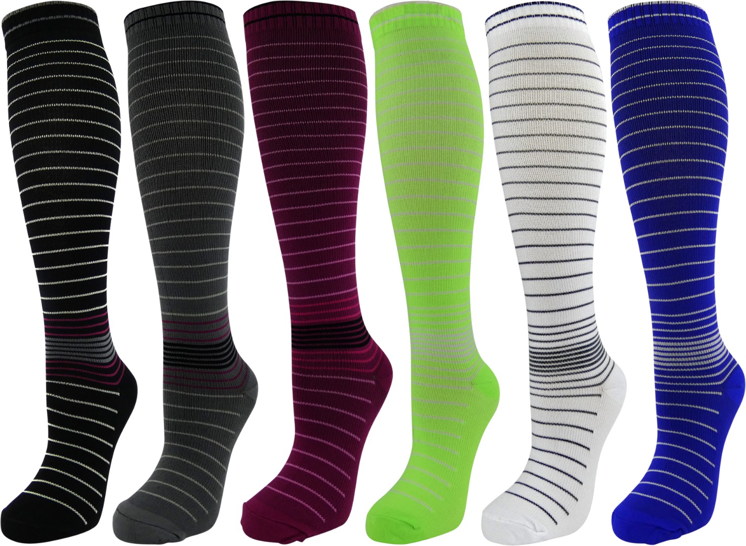 6 Pair Small/Medium Premium Quality Colorful Moderate Graduated Compression  Socks 15-20 mmHg. Nurses, Running, Travel, Knee-High, Mens and Womens Style & Assorted Color Thin Striped Designs