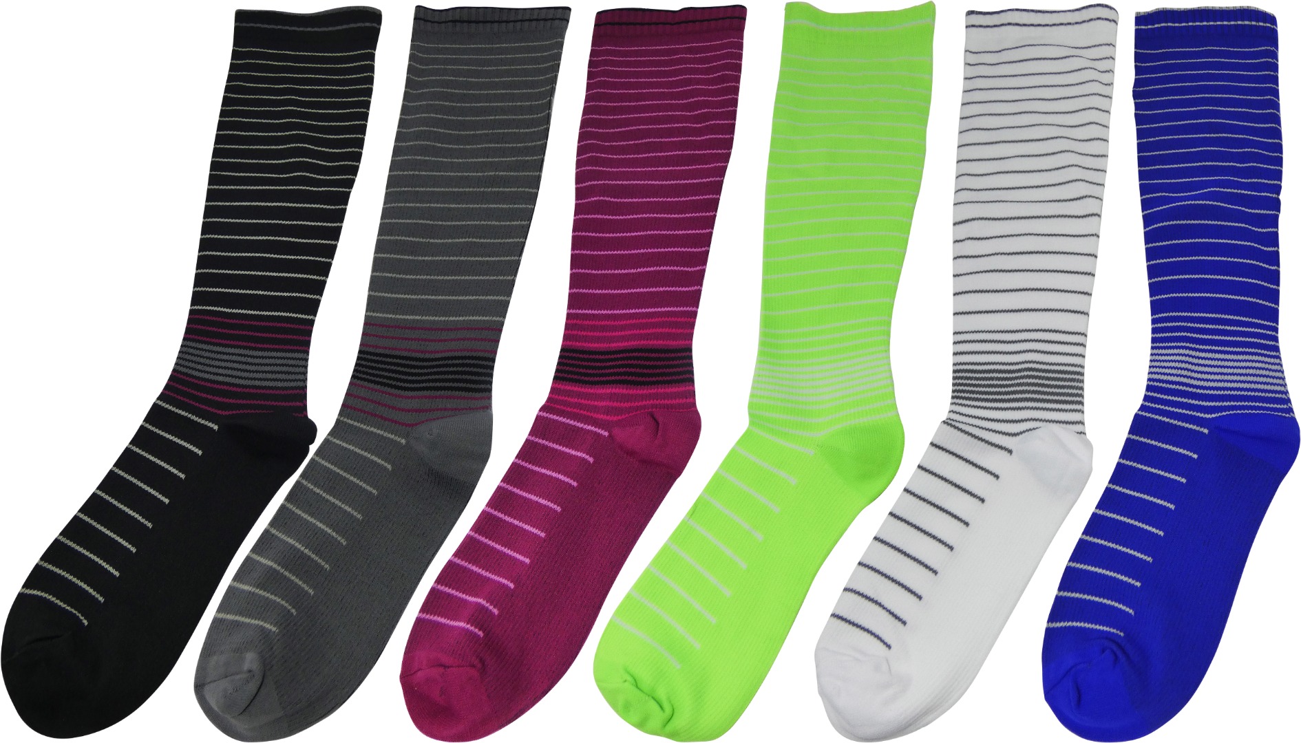 Light Ribbed Fashionable, Fun, Colorful Knee-High Stockings for business, sports or casual wear. Anatomic Design with toe & heel pockets, Non-Restrictive Top Band with Stay-Up Performance. Assorted Designs & Colors. This 6 Pack: Assorted Colors Black, Grey, Blue, Purple, Green & White Thin Stripe Pattern.