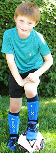 Hard outer shell for solid cushioning, durable, long-term use & extended playing time at practices, training, match & tournament play. Thick, lightweight EVA backed foam pads cushion legs. Elastic nylon strap bands with Velcro adjust for comfort around the calf. Stretchable foot sleeve secures shinguard beneath the ankle for added stability & to stay in place better. 1 Pair Blue, Size XS. 1 Pair Blue Knee-High Youth Long Graduated Compression Socks. Fits Boys & Girls ages 4-7