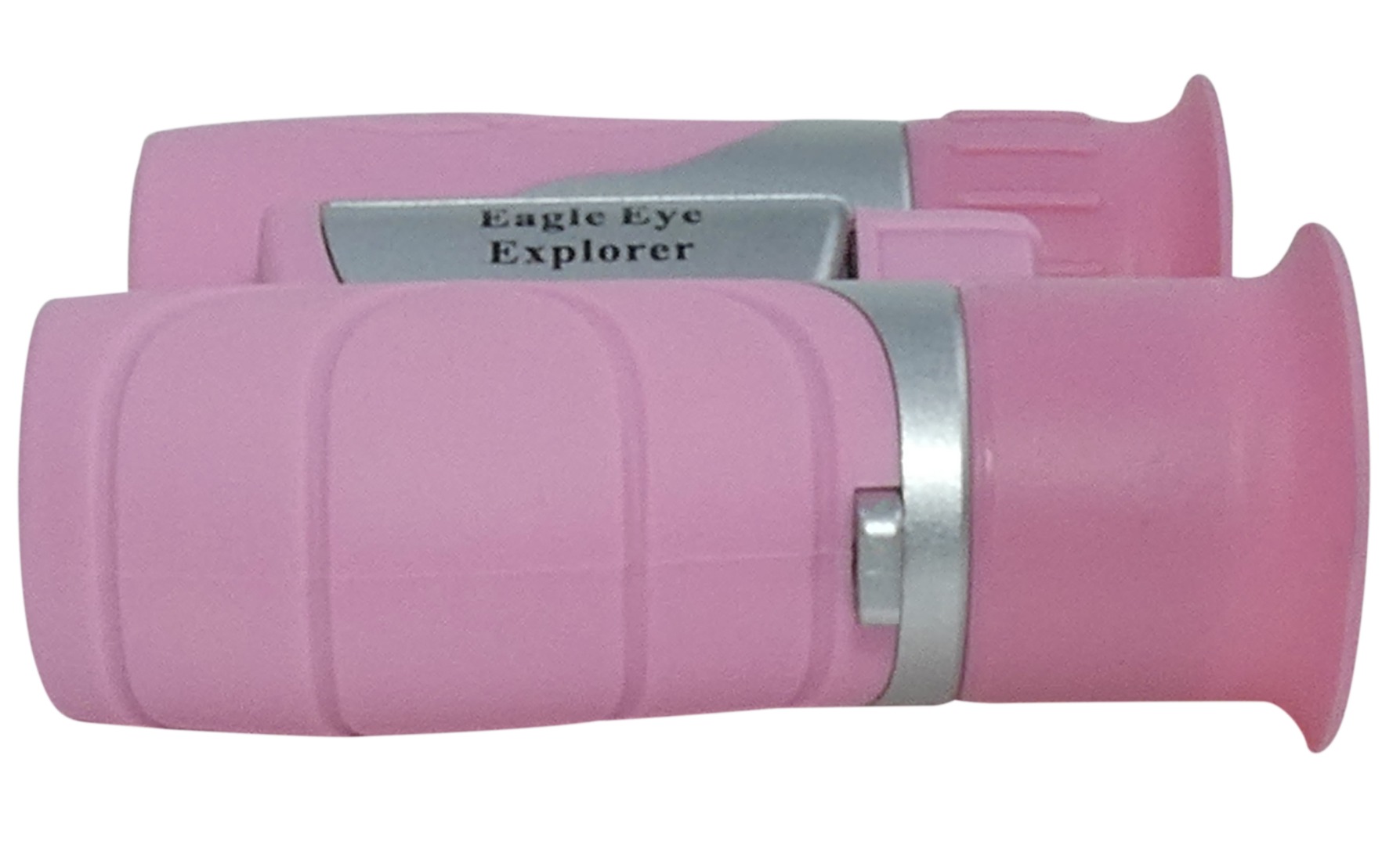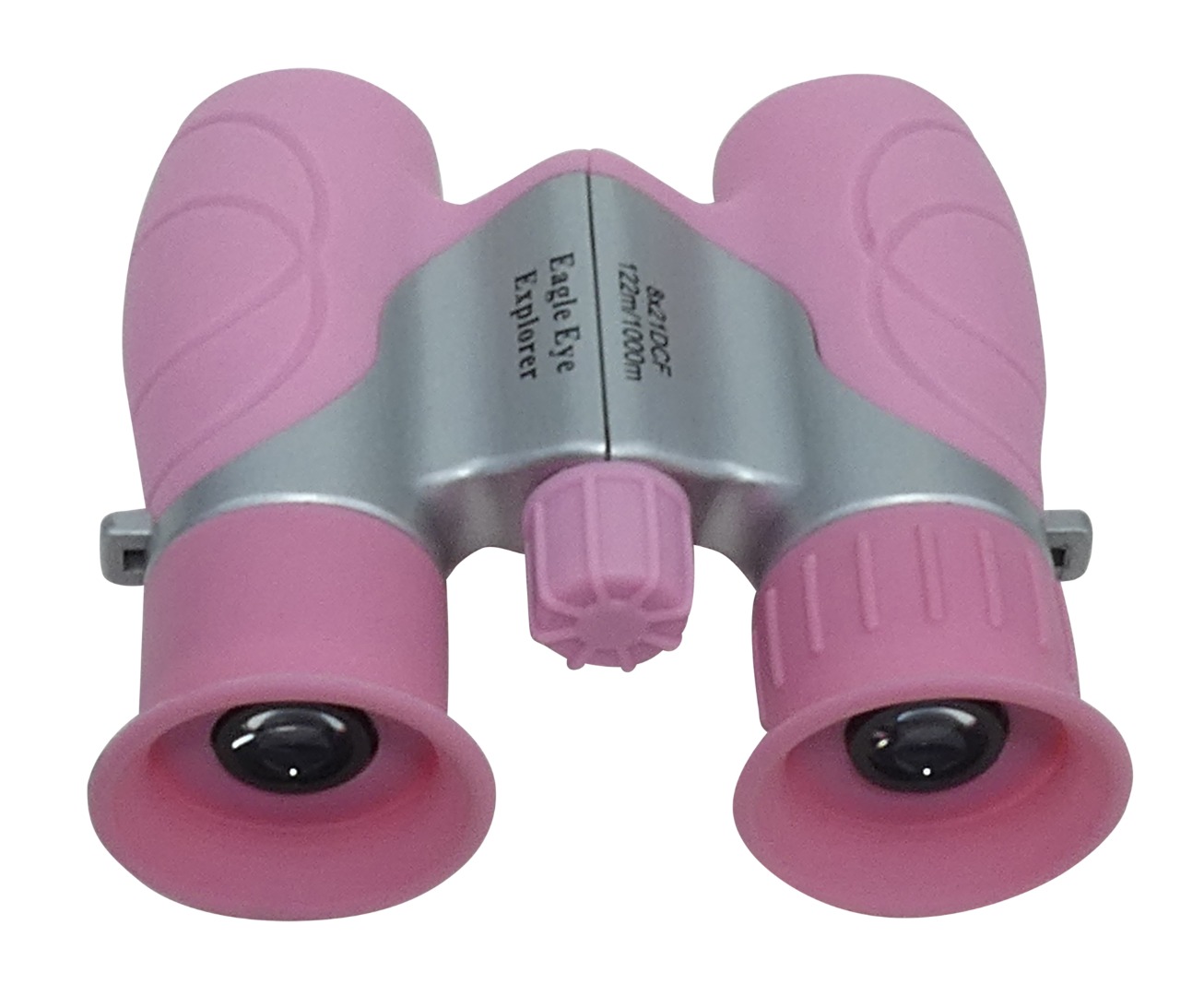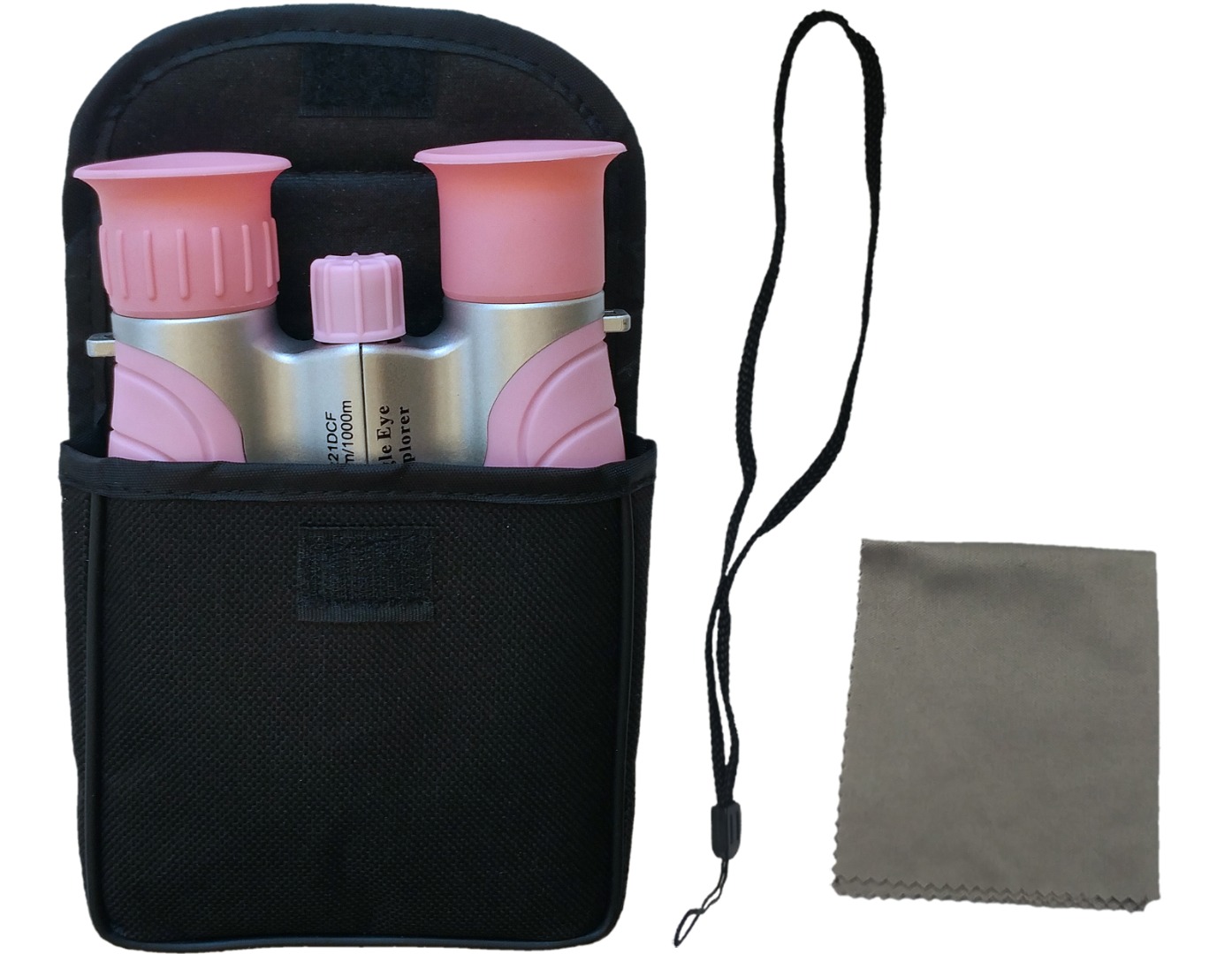 Advanced optics with 8x21 Magnification & 120/1000m Zoom, features safe and soft rubber eye pieces for child protection. Made small enough for little hands to hold with easy to adjust, simple to use focus knob. Engineered with durable shock-resistant material for all your child's fun adventures. Includes Carrying Case, Wrist Strap and Optical Cleaning Cloth. Color: Pink & Silver