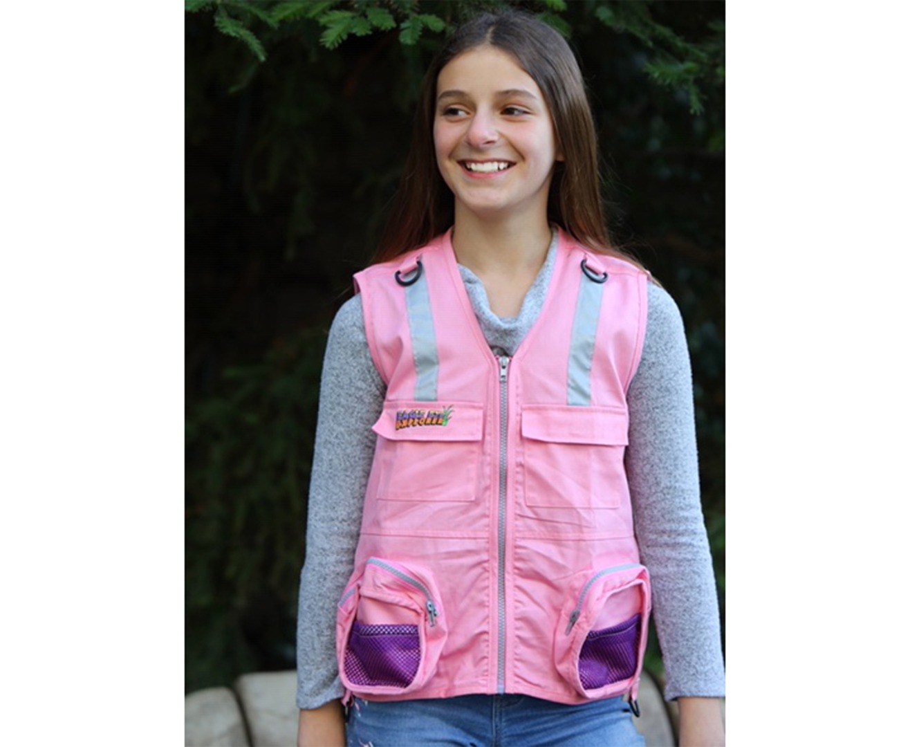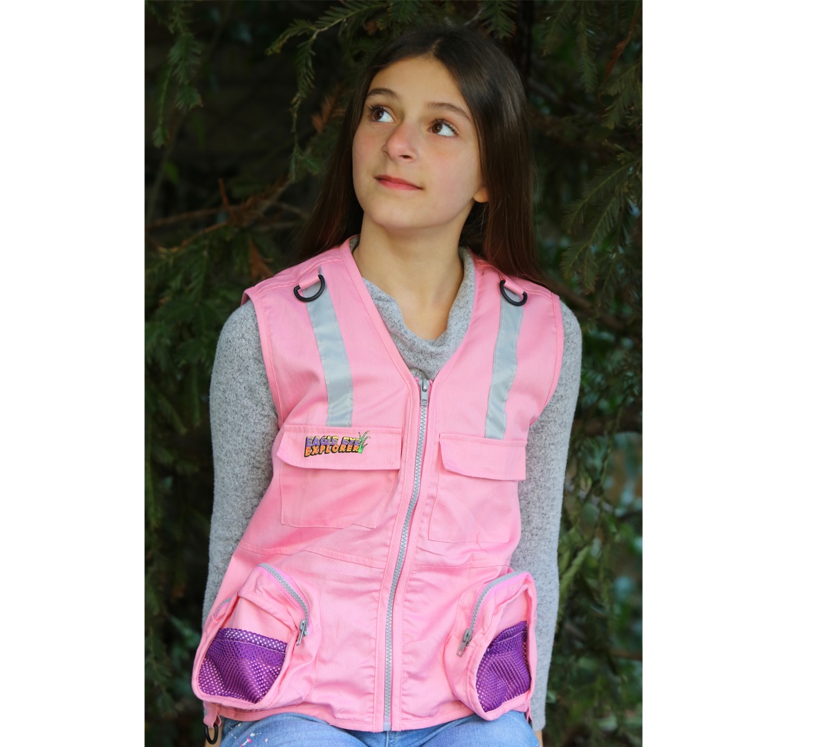 Roomy design is made to fit children ages 4-7(sizes 6-8). With 2 Velcro pockets, 2 Large Zipper ones (big enough to fit binoculars), and 2 mesh pouches there is plenty of space to store gear and collected "treasures." The rugged construction with reinforced stitching is made of lightweight 100% cotton and is durable for use indoors and outdoors. The 4 sturdy D rings are great for attaching equipment or other accessories. Color: Pink. Size: Small Medium