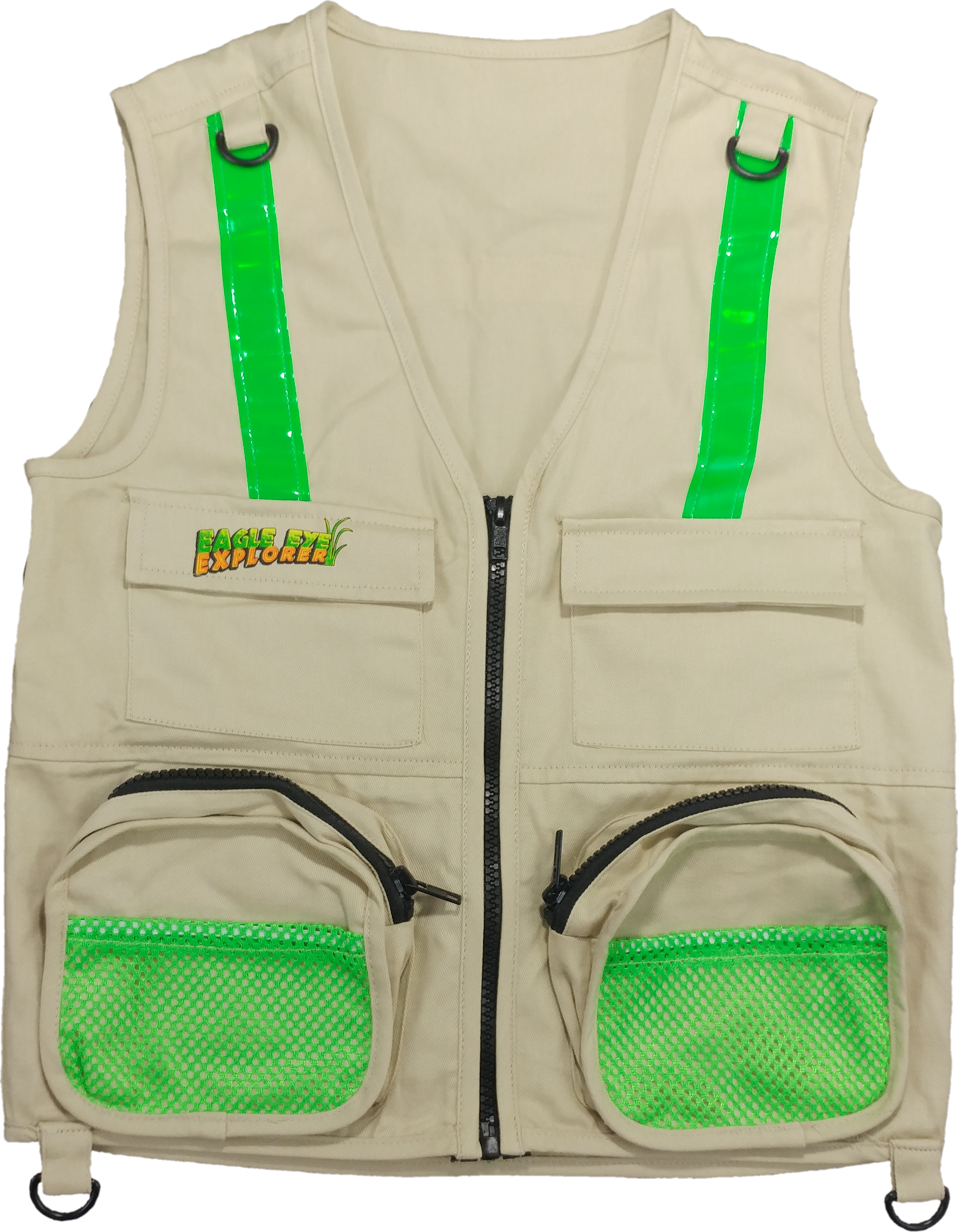 Roomy design is made to fit children ages 8-11 (sizes 9-10). With 2 Velcro pockets, 2 Large Zipper ones (big enough to fit binoculars), and 2 mesh pouches there is plenty of space to store gear and collected "treasures." The rugged construction with reinforced stitching is made of lightweight 100% cotton and is durable for use indoors and outdoors. The 4 sturdy D rings are great for attaching equipment or other accessories. Color Tan. Size: Medium/Large