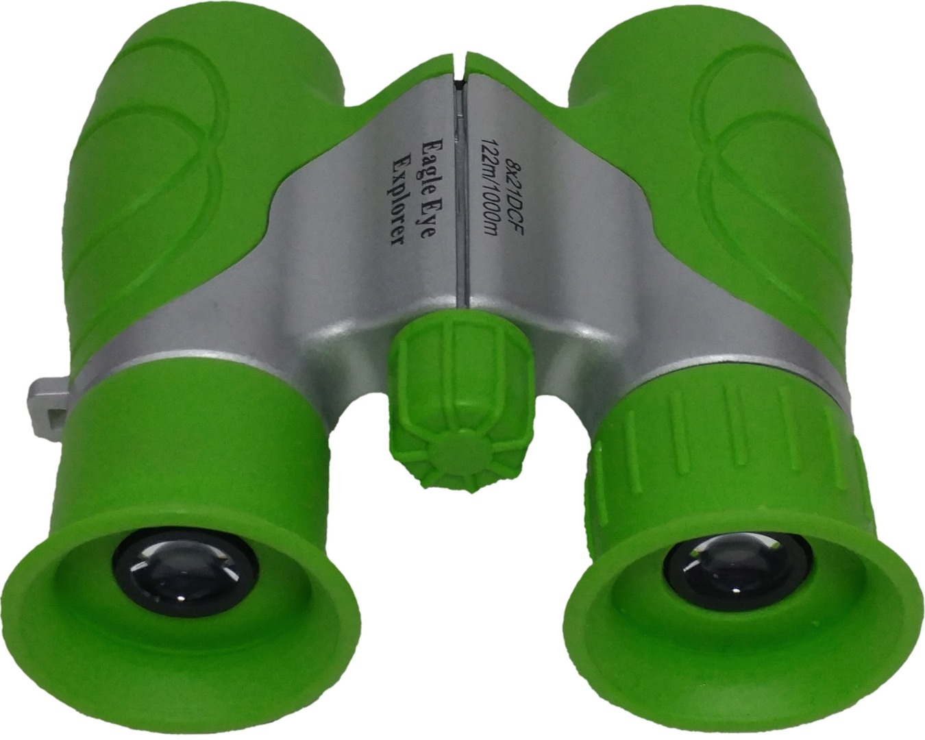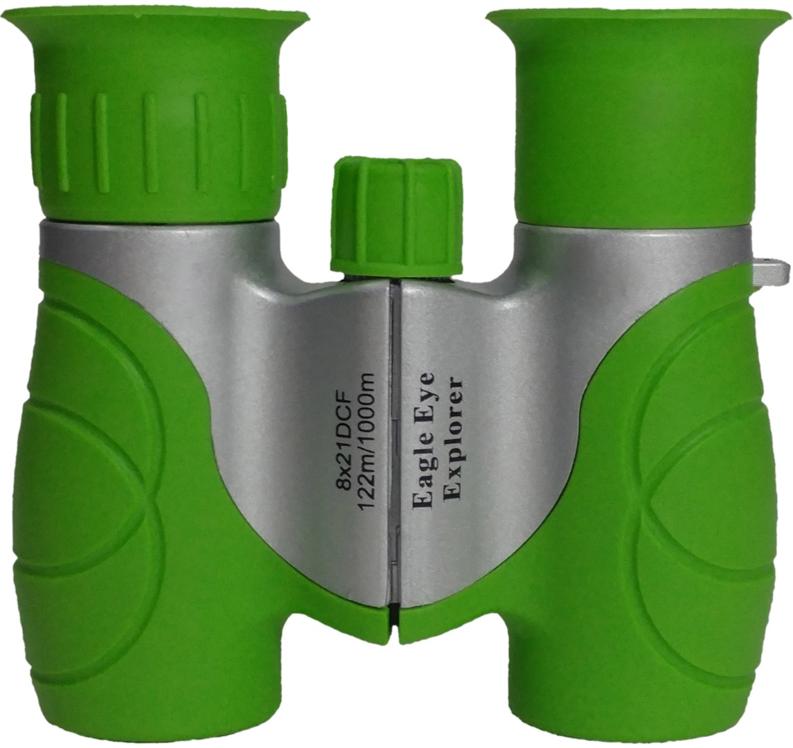 Advanced optics with 8x21 Magnification & 120/1000m Zoom, features safe and soft rubber eye pieces for child protection. Made small enough for little hands to hold with easy to adjust, simple to use focus knob. Engineered with durable shock-resistant material for all your child's fun adventures. Includes Carrying Case, Wrist Strap and Optical Cleaning Cloth. Color: Green & Silver