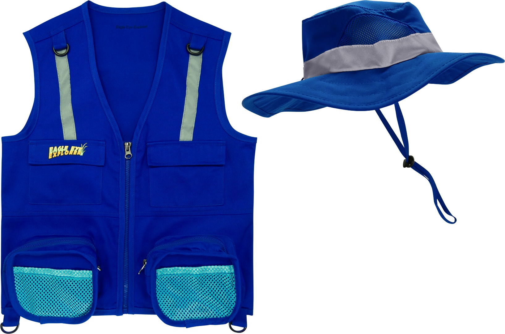 Eagle Eye Explorer Set is Perfect for Exploring, Bird Watching, Bug Collecting, Photo Safaris, Fishing, Hunting, Learning, Stargazing, Hiking, and Imaginative Adventures of all kinds. Included are one Eagle Eye Explorer cargo vest with reflective safety bands and one Safari Hat with adjustable head band and adjustable Chin Strap.