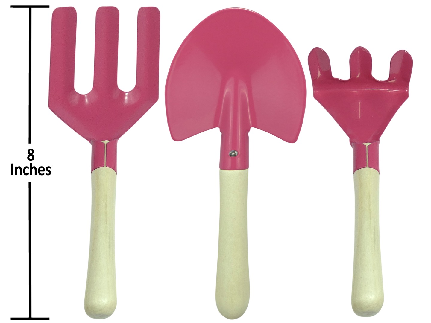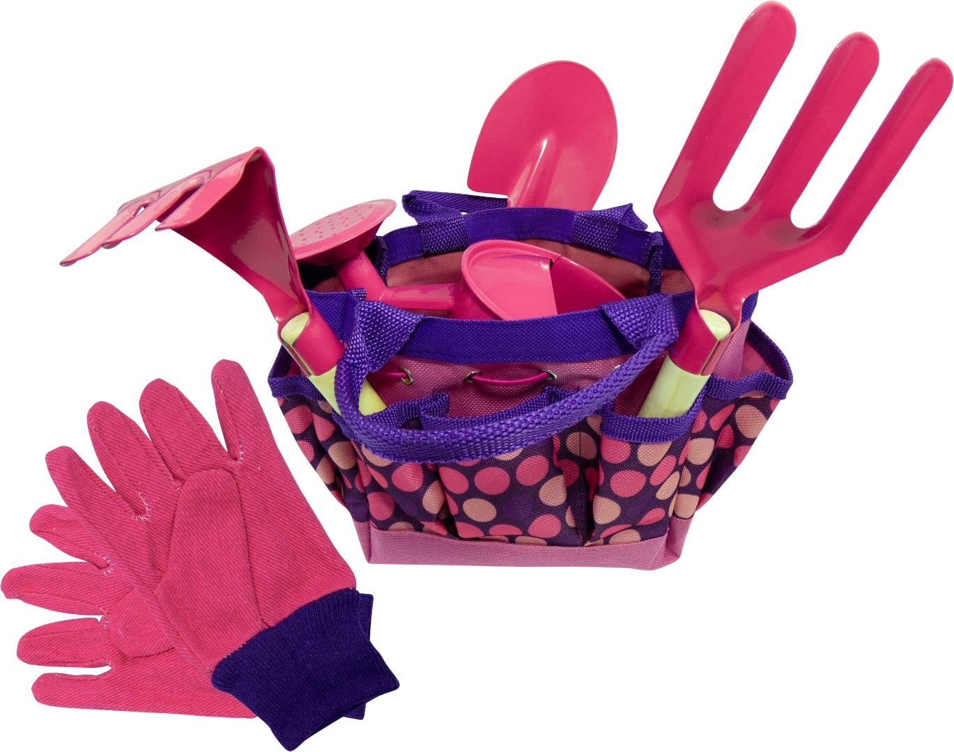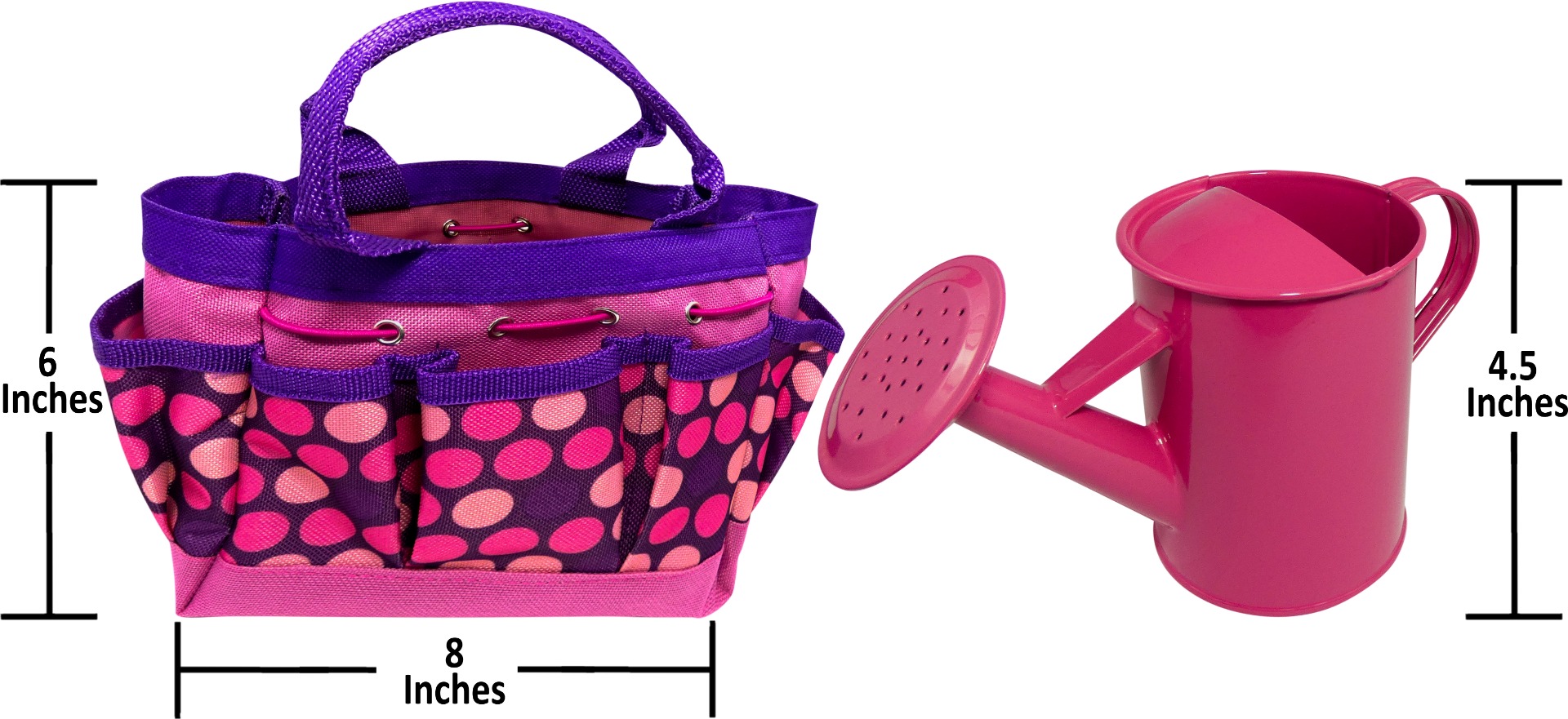 Eagle Eye Explorer 7 piece all-in-one toy kit strong for all season outdoor and backyard games & activities. Lightweight 8" trowel, 3 prong raking hoe & pitchfork tools, made real-life garden & nature exploration. Matching 4.5" pitcher with handle & spout to carry & pour water. Sturdy 8" organizer bag to hold & organize tools, accessories, seeds, & toys. Thick heavy-duty cloth gloves to protect children's hands. For children ages 4-7 years old. Pink
