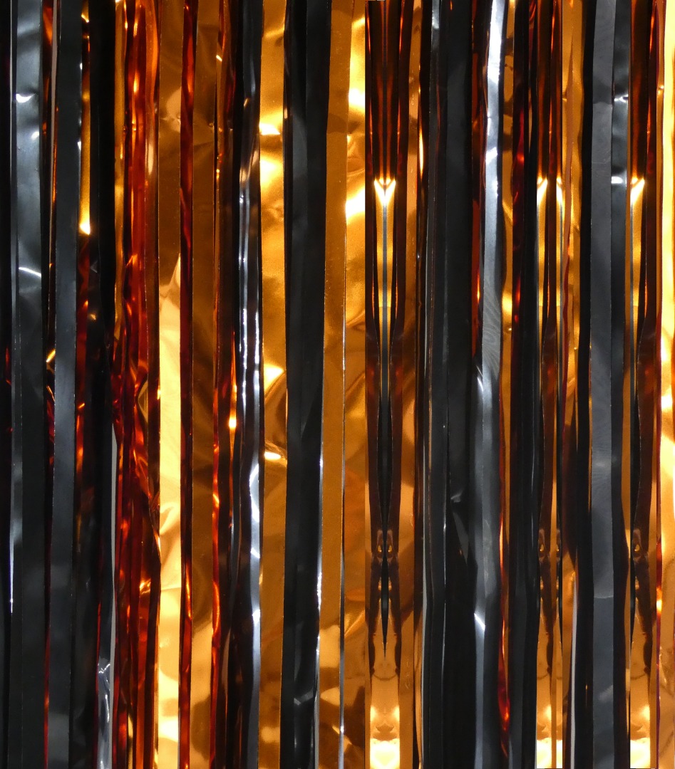 2 Large each measuring 3.28 ft. x 6.56 ft. foil streamer curtain made of flame and fire-resistant polyvinyl chloride film, coated with a shiny metallic finish to add sparkle and pizzazz to any decor. Lightweight, durable, easy to safely store and is reusable. Hang or tape as a backdrop cover on walls, windows, curtains or in doorways, photo booth background. Can be paired with LED lights, balloons, banners and other party decorations indoor and outdoor. Qty. 2 Black & Orange