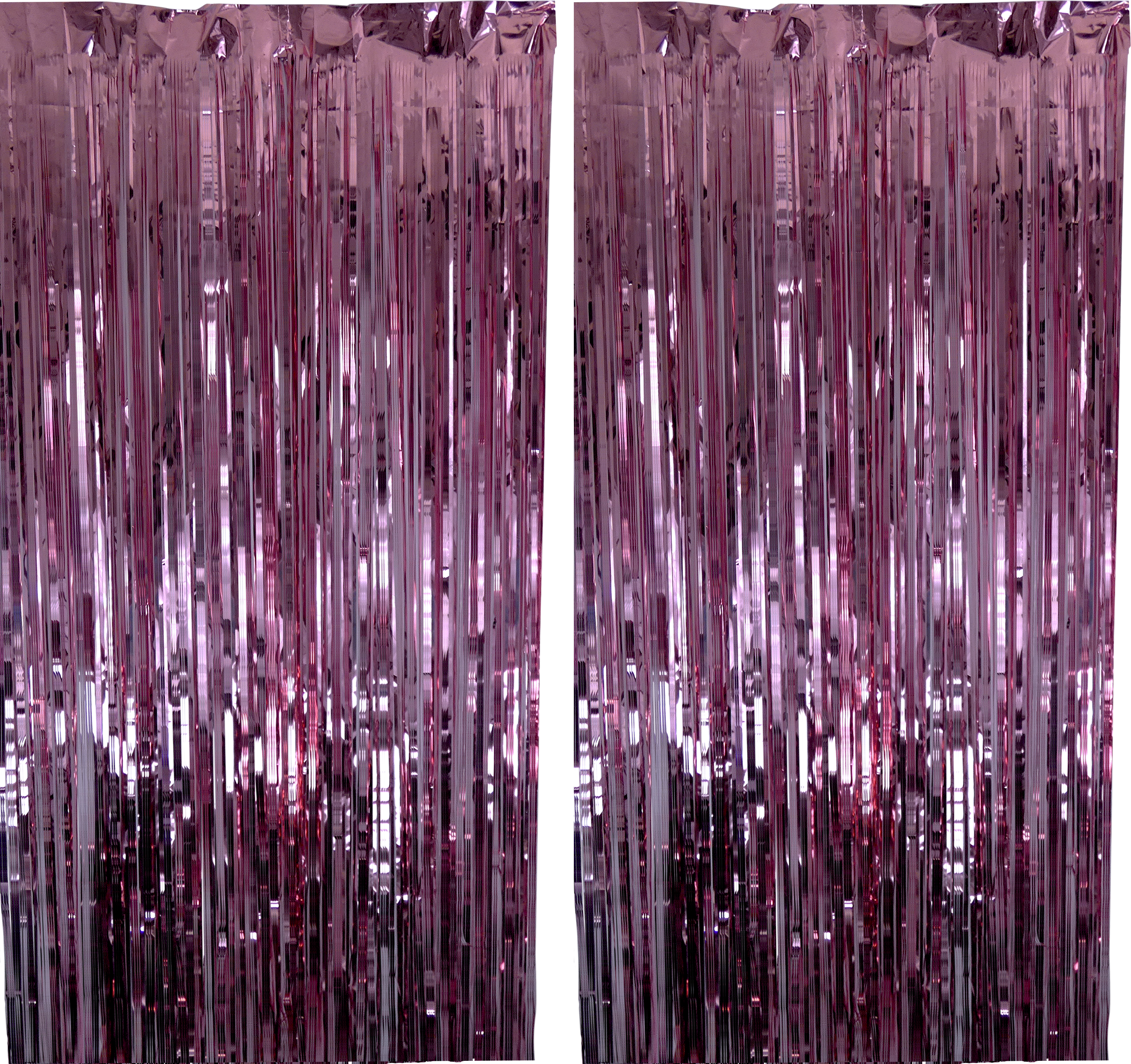 2 Large each measuring 3.28 ft. x 6.56 ft. foil streamer curtain made of flame and fire-resistant polyvinyl chloride film, coated with a shiny metallic finish to add sparkle and pizzazz to any decor. Lightweight, durable, easy to safely store and is reusable. Hang or tape as a backdrop cover on walls, windows, curtains or in doorways, photo booth background. Can be paired with LED lights, balloons, banners and other party decorations indoor and outdoor. Qty. 2 Pink