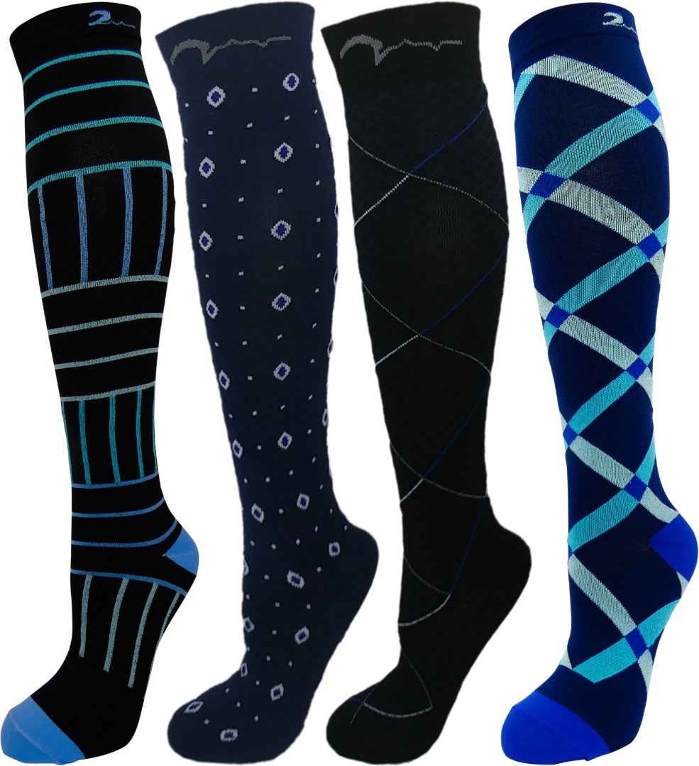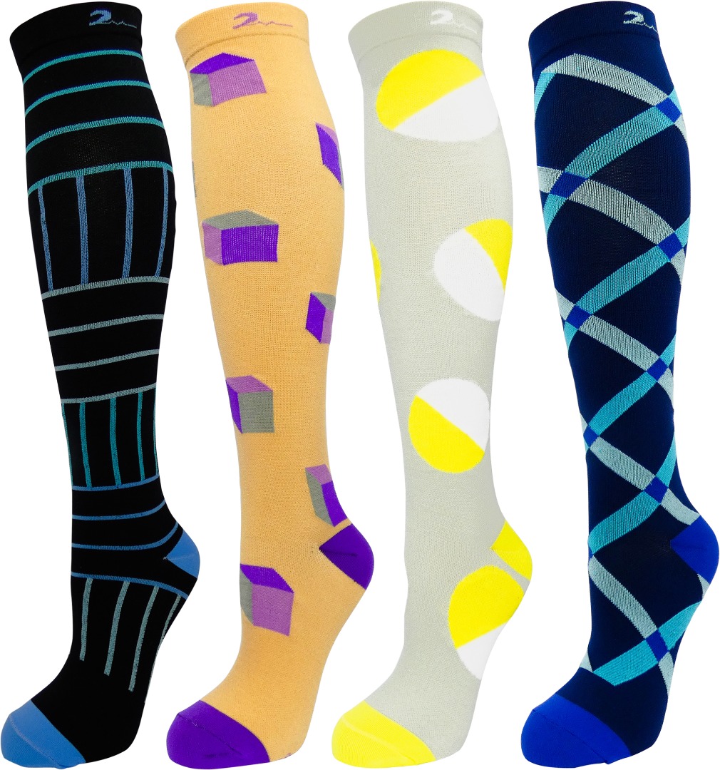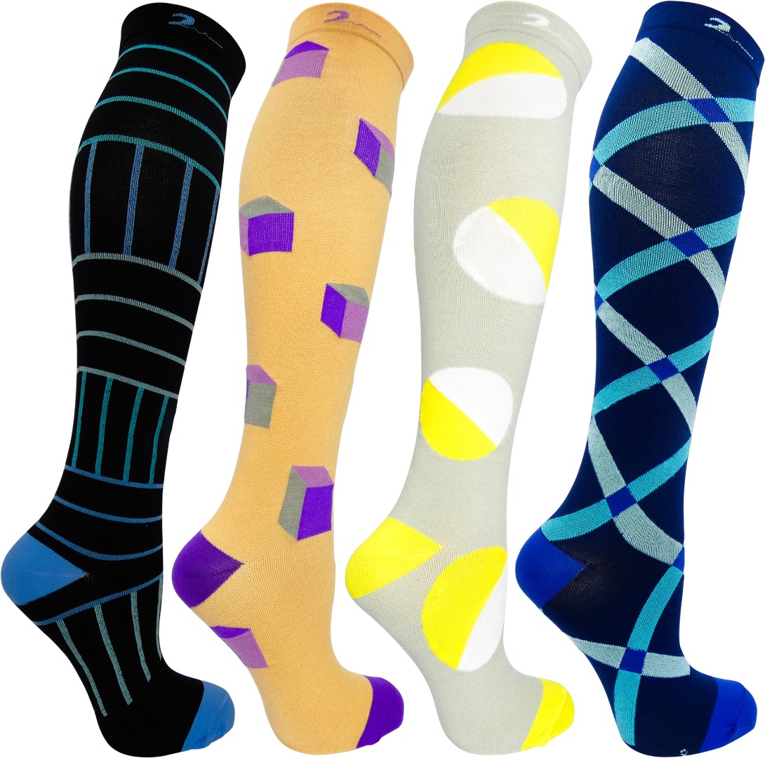 Men's and Women's Comfort Blend. Fashionable & Fun Colorful Knee-High Stockings for business, sports or casual wear. Anatomic Design with toe & heel pockets. Non-Restrictive Top Band with Stay-Up Performance. Assorted Colors and Styles Available. This 4 Pack: Black with Blue & Turquoise Pillar Design, Beige with Grey & Purple 3D Cube Pattern, Light Grey with Yellow & White Polka Dots, Navy with Teal & Light Blue Thatched Diamond Pattern