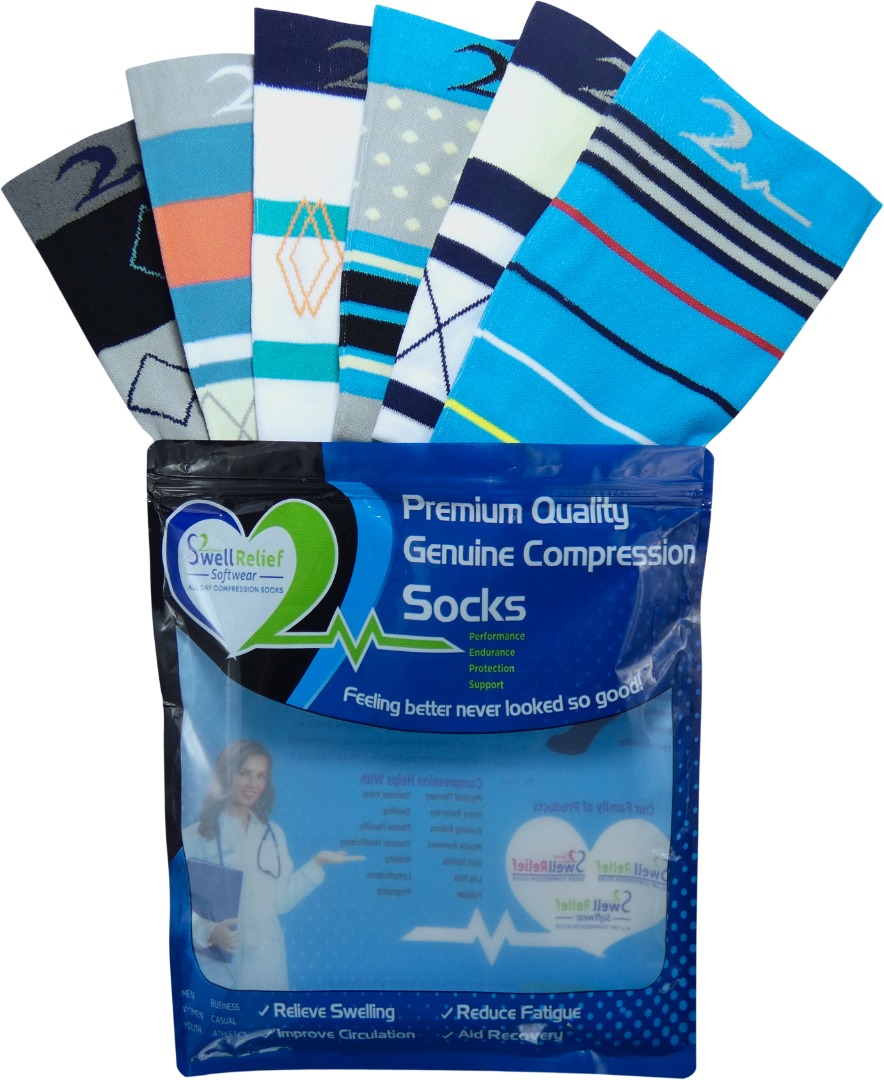 Swell Relief Extra-soft Premium Quality SoftWear Moderate/Medium Graduated Compression 15-20 mmHg Lightweight Knee-High Stockings. Designed for support, and comfort. Fits Womens US shoe size 8-10 & Mens US size 5-9. Total Qty.This Collection: 6 Pair. Medium/Large