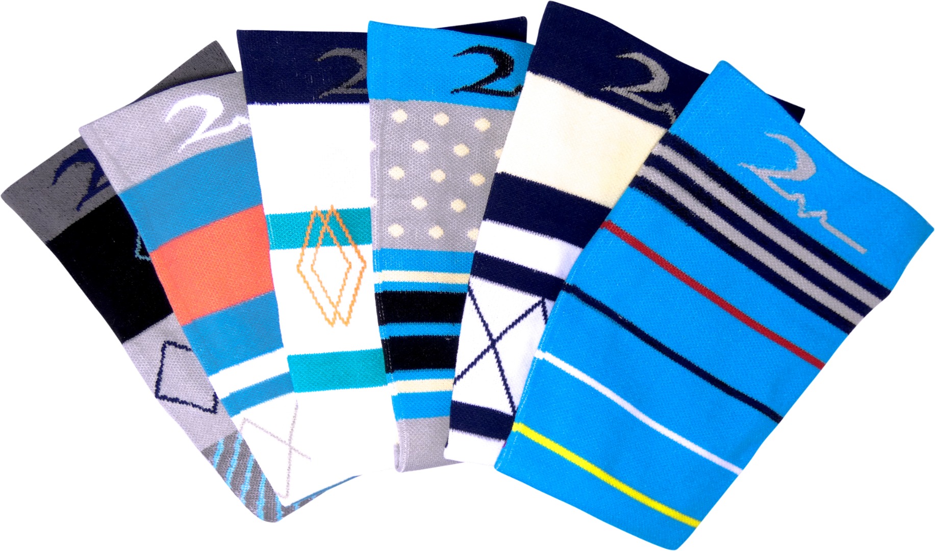Men's and Women's Comfort Blend. Fashionable & Fun Colorful Design Socks for work, business, sports or casual wear. Anatomic Design with toe & heel pockets. Non-Restrictive Top Band with Stay-Up Performance. Assorted Colors and Styles Available. This 6 Pack: Blue Multi-Color Stripe; Navy, White & Beige Pattern; Black, Grey & Blue Block; Grey, Blue & Beige Stripe Polka-Dot; White & Aqua Diamond Stripe; Turquoise & Coral Pattern