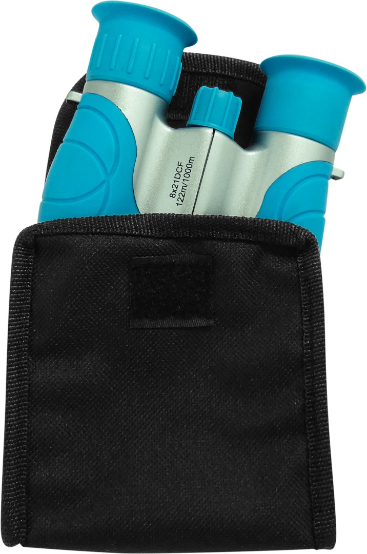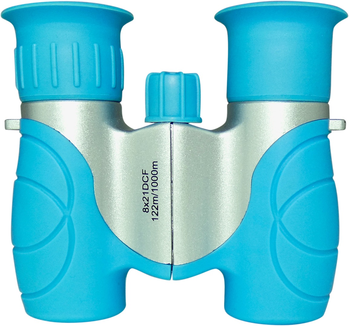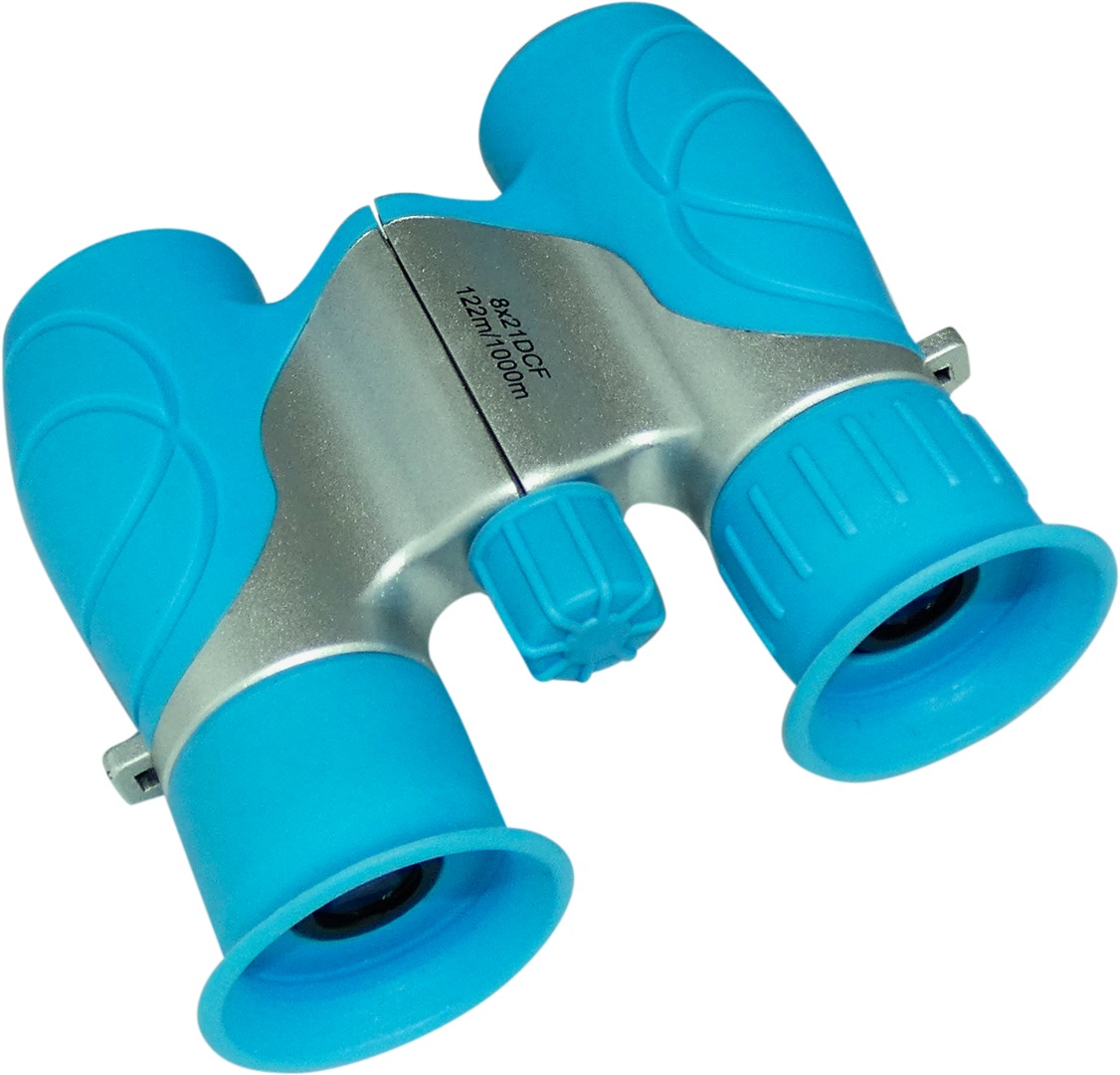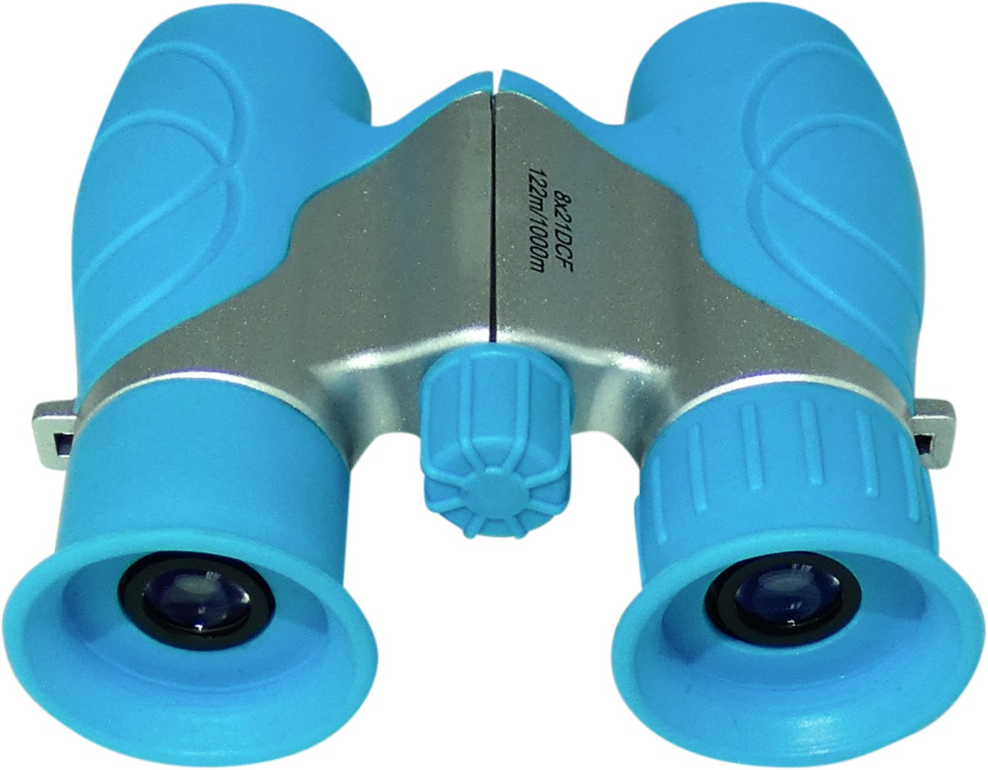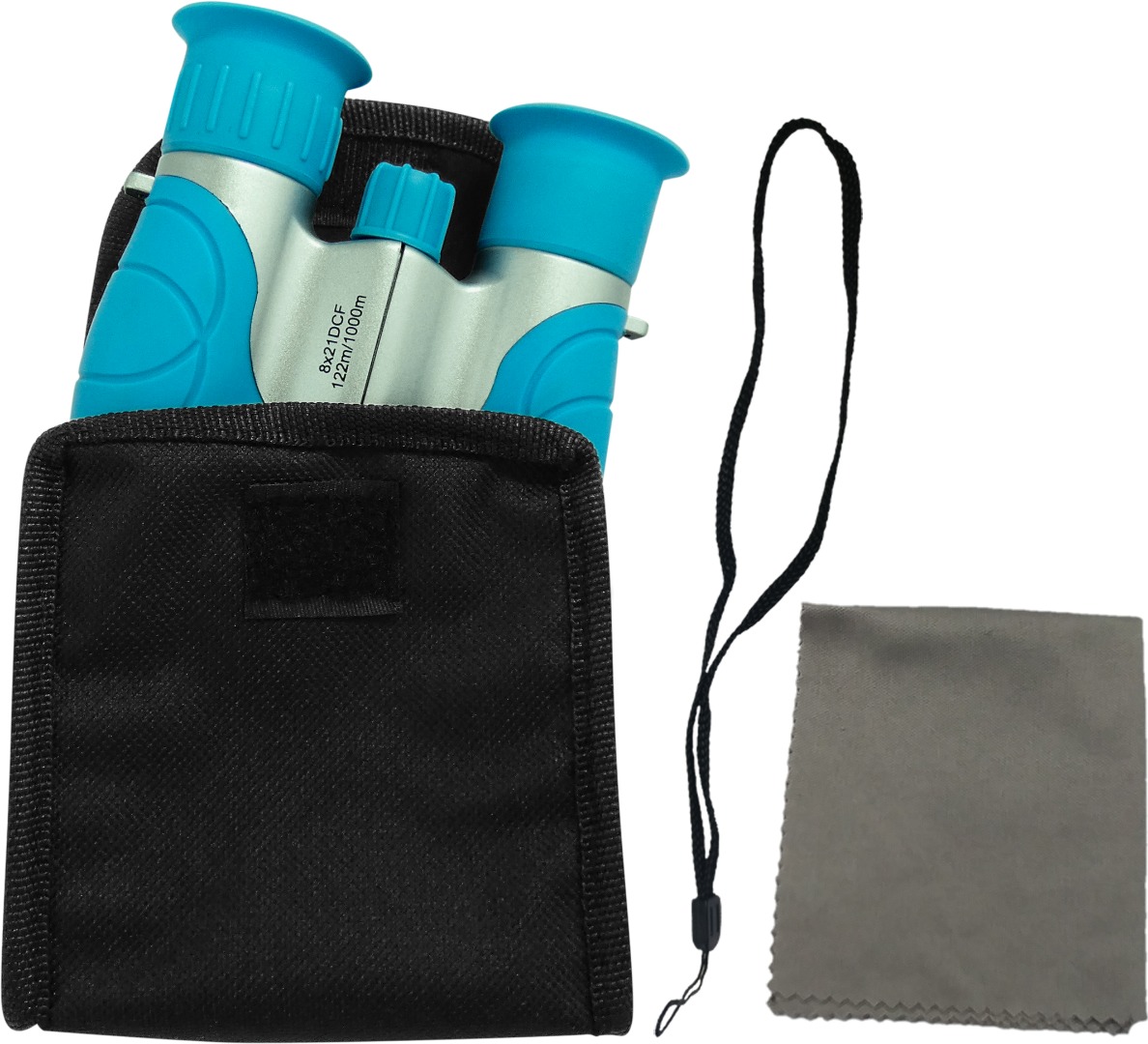 Advanced optics with 8x21 Magnification & 120/1000m Zoom, features safe and soft rubber eye pieces for child protection. Made small enough for little hands to hold with easy to adjust, simple to use focus knob. Engineered with durable shock-resistant material for all your child's fun adventures. Includes Carrying Case, Wrist Strap and Optical Cleaning Cloth. Color: Blue & Silver